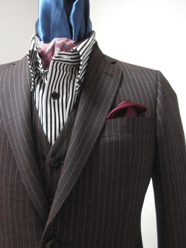 アフリカンブラウンにレザーベージュのペンシルストライプの服地でオーダー頂きました。